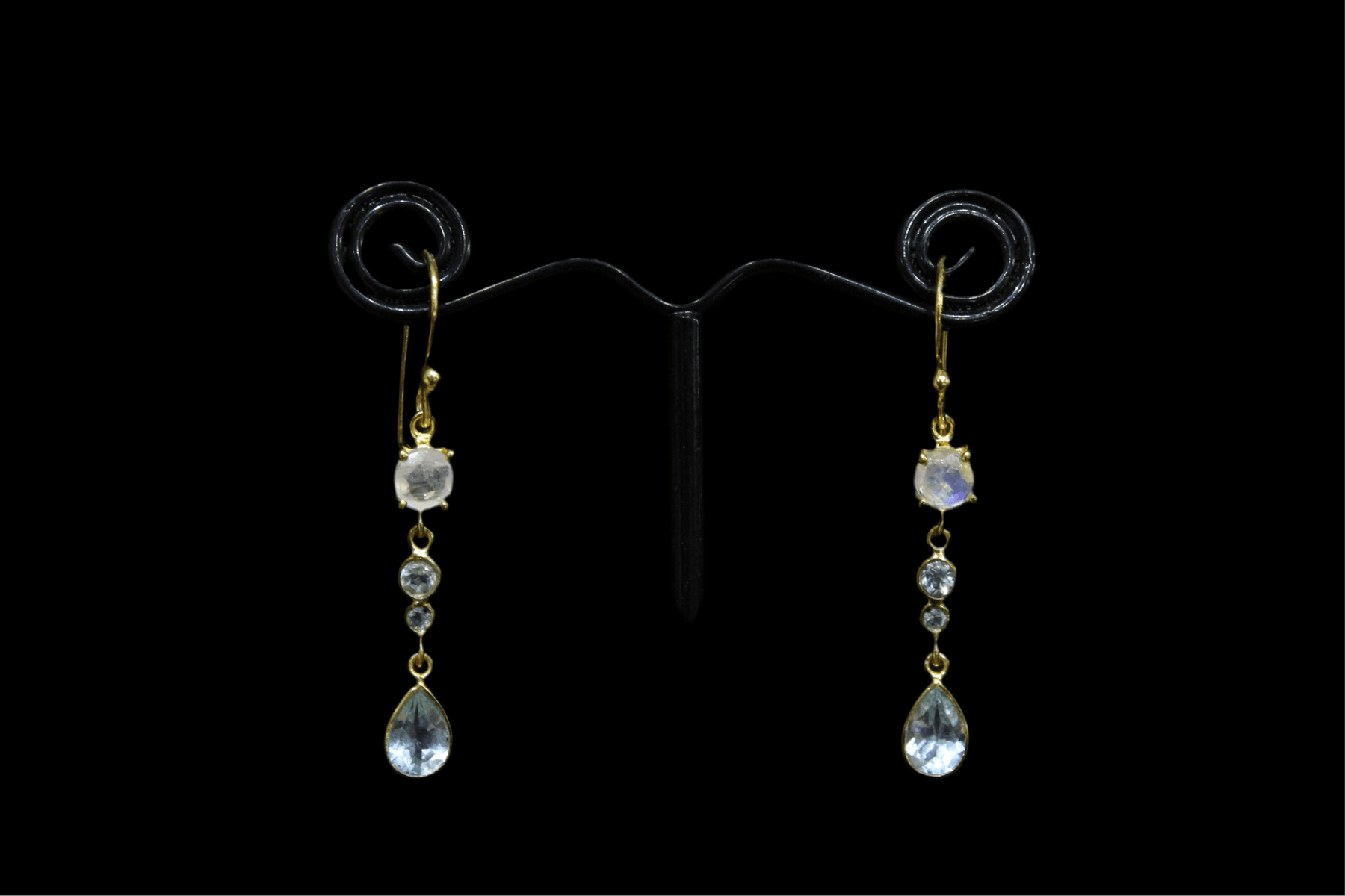 Explore the ethereal beauty of these Moonstone and Blue Topaz Earrings. Handcrafted with gold plating, these dangly earrings feature shimmering moonstone and vibrant blue topaz gemstones. Experience the natural healing properties of these gems and add a touch of elegance to any outfit.