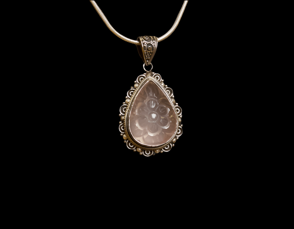 Teardrop Rose Quartz Pendant – 1.25” long and set in 92.5 sterling silver, featuring a delicately carved flower design. Rose Quartz is known for fostering love, compassion, emotional healing, and inner peace. Each piece is handmade and fair trade.
