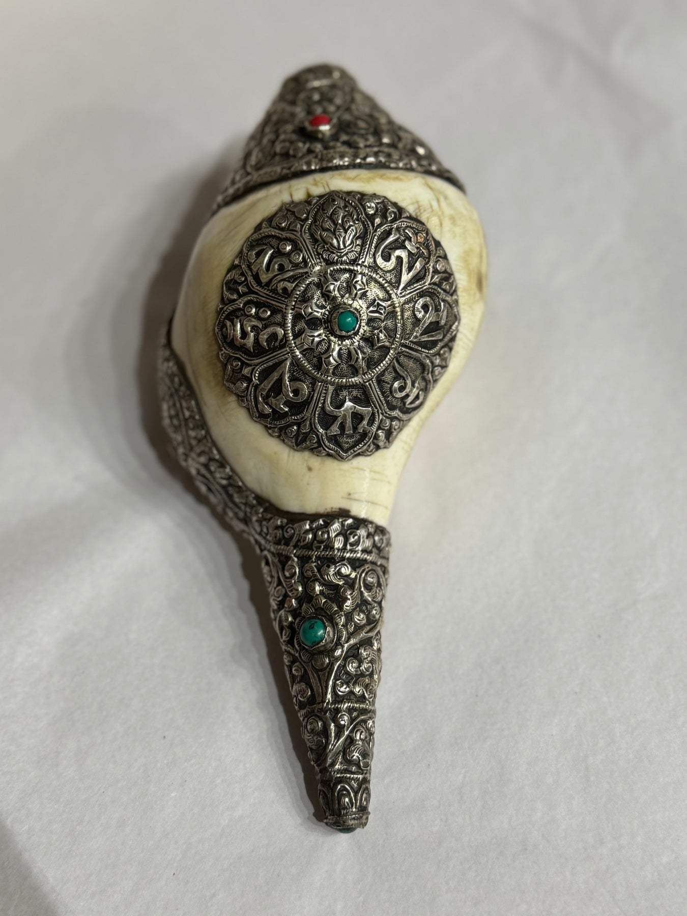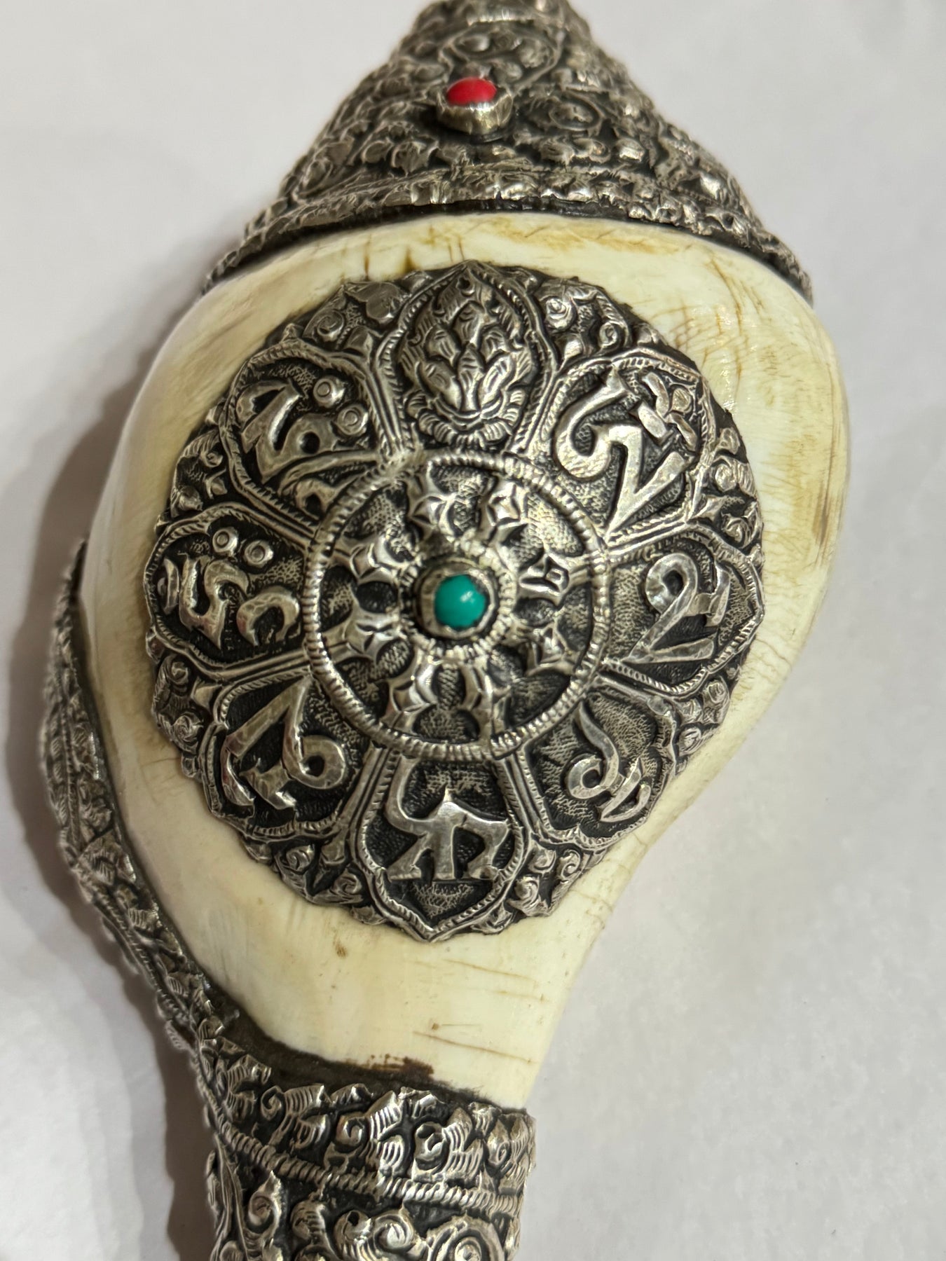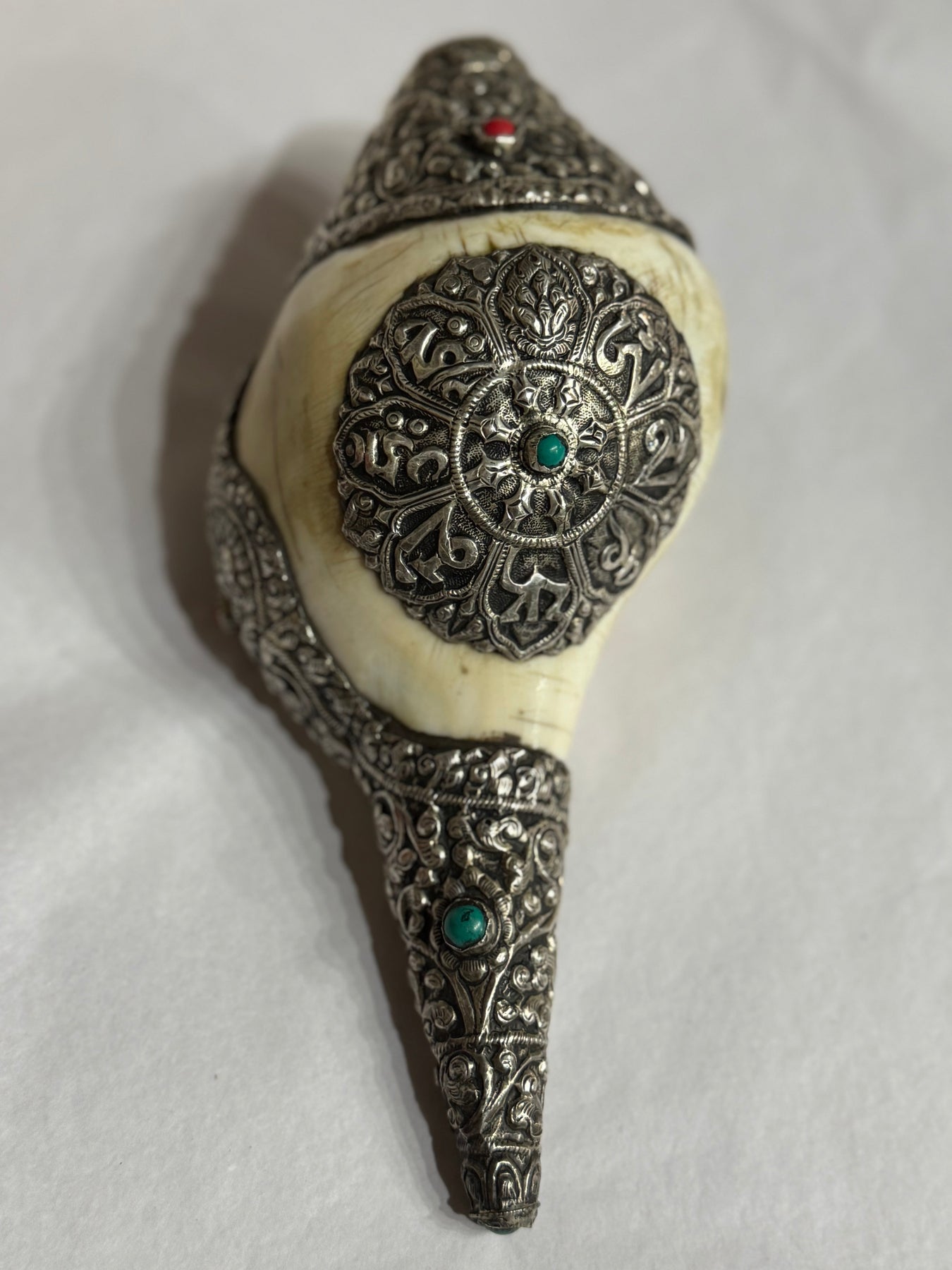 Conch shell horn (Dungkar) with hand hammered silver work of the Compassion mantra for endless compassion throat the universe. Set with Sterling, turquoise and coral for the balance of chakra energy in your space. The conch shell (Dungkar) represents the resonant, melodious, and pervasive sound of the Dharma, awakening disciples from ignorance and guiding them to accomplish the benefit of oneself and all mother beings. The Conch is most commonly used in Buddhist and Hindu rituals.