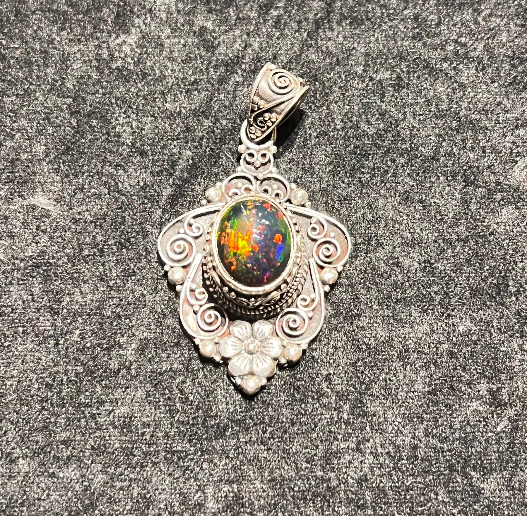 Beautiful fire opal pendent with stunning silver craftsmanship surrounding the stone. Height is 1.5” and width is 1”. 92.5 silver.