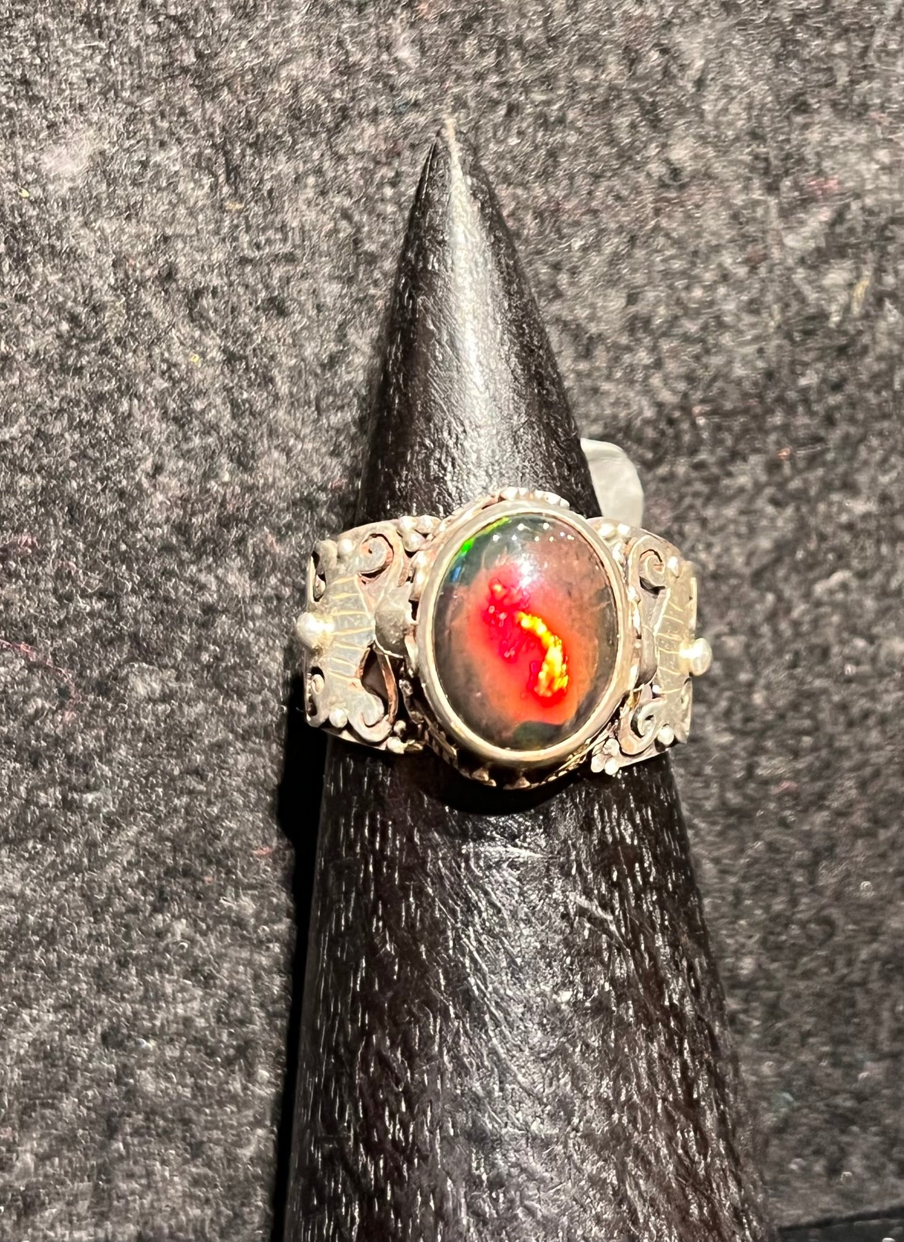 Stunning, fire opal ring with deep red and green notes in the stone. Length is 0.5” and width is 0.5”. 92.5 silver, size 7