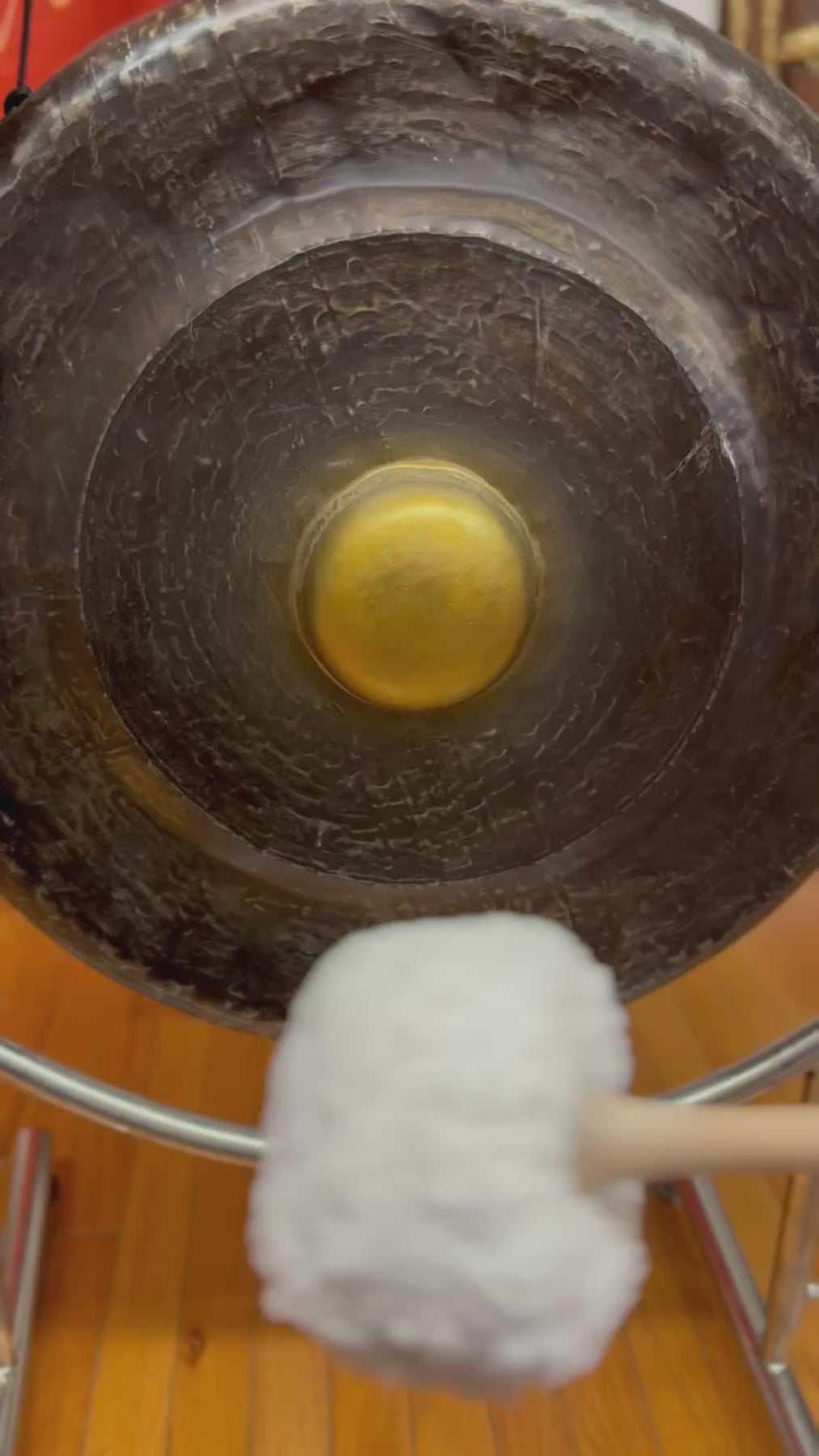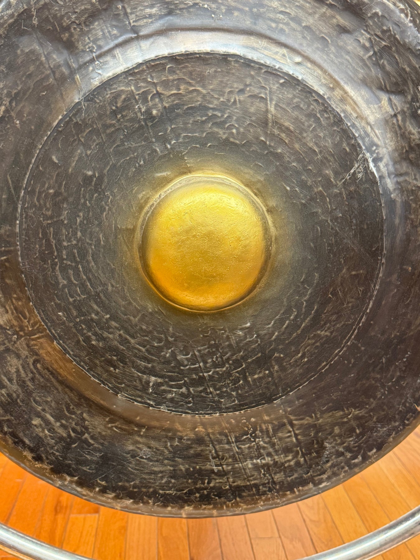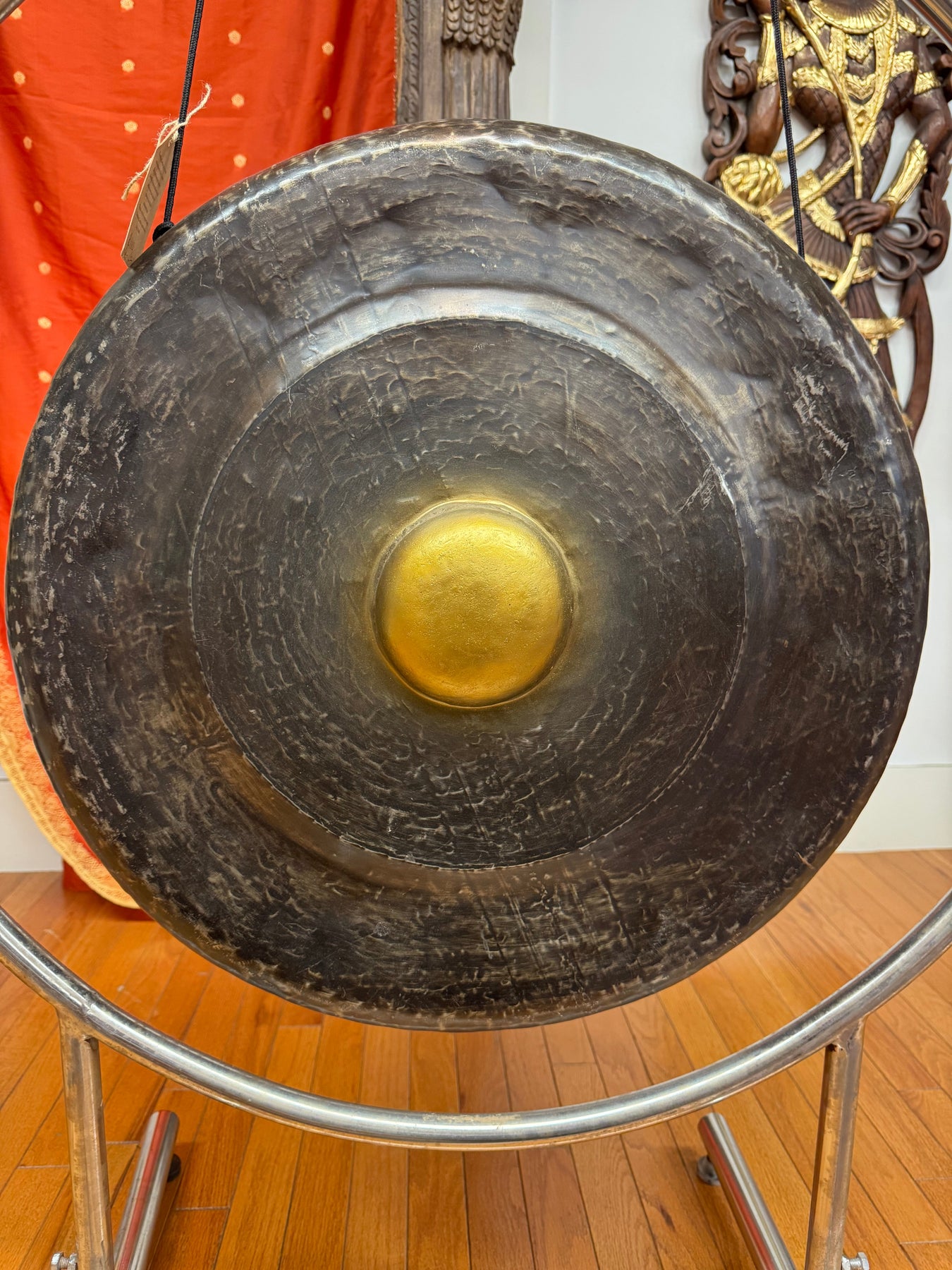 Gamelan Gong for traditional Gamelan music or for transformative sounds in a lovely gong meditation for the solar plexus chakra realm. This gong has a great low tone and good segue gong for a meditation. This is a 5 metal Gamelan gong. Comes with stand and single mallet. 23.5” wide.